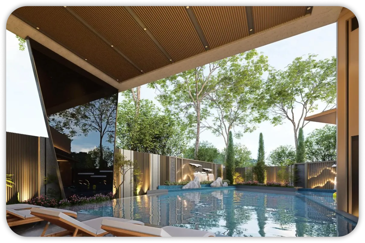 Ruang fleksibel dalam hunian ini juga dilengkapi high ceiling setinggi 3.6 – 4.8 m, yang memaksimalkan cahaya alami dan sirkulasi udara. Hasilnya, rumah terasa lebih lapang, sejuk, dan nyaman untuk seluruh anggota keluarga.